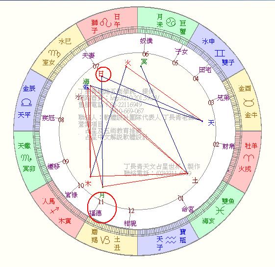 這裡簡言占星論吉凶之法,便在於星體相位為依憑,如丁某設計之星盤中,凡紅線是凶相位、藍線為吉相位。若再加上大家明白各星體所代表的行業別:太陽代表政府官員及娛樂業;